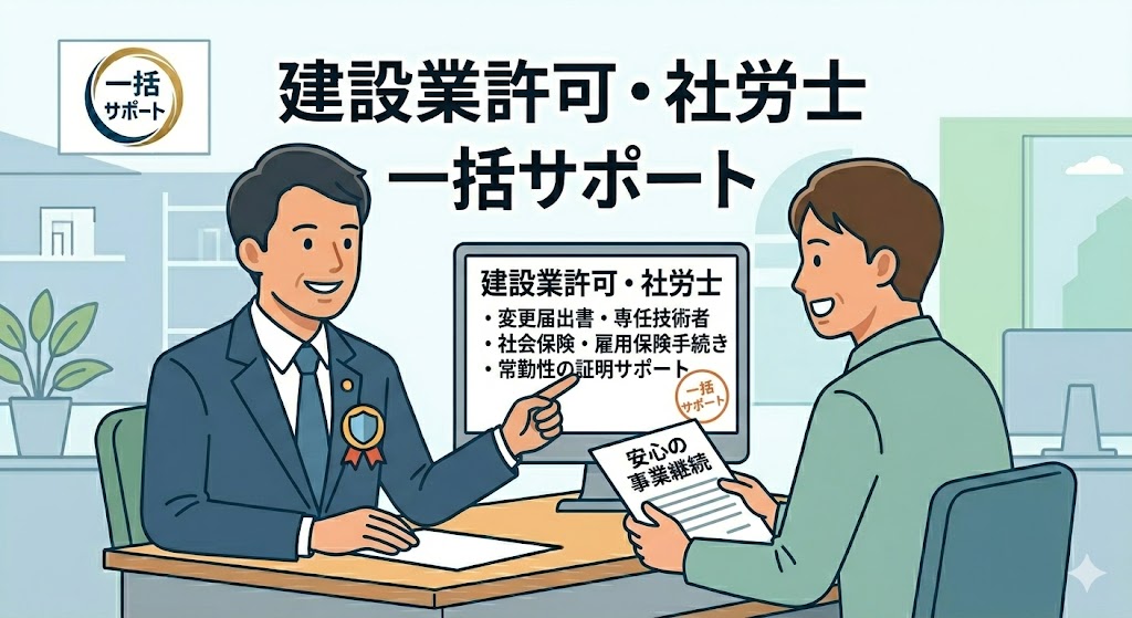 当事務所では、行政書士としての「建設業許可の変更届」と、社会保険労務士としての「社会保険加入手続き」を、ダブルライセンスを活かしてワンストップでサポートしております。